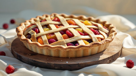 AI Generated. A delicious lattice topped pie with colorful fruity filling on a board