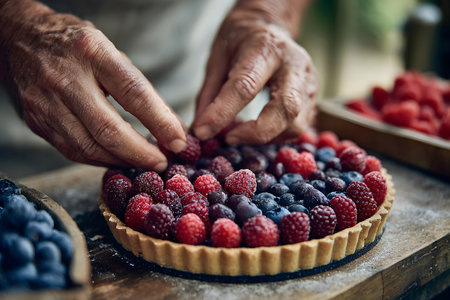Hands carefully arrange fresh raspberries and blueberries on a tart crust, showcasing a delicious dessert made with seasonal fruit in a warm kitchen.