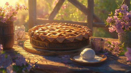A mouthwatering scene featuring a freshly baked apple pie topped with ice cream, surrounded by colorful spring flowers in a rustic garden, capturing warmth and delight.