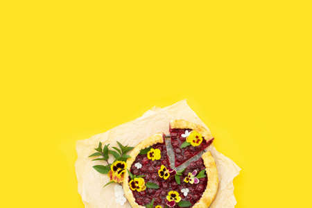 Spring cherry pie, decorated with edible flowers on a yellow background. Hello summer. Concept baking, cookbook recipes, bakery banner, cafe advertisement. Vacation sales spring, summer and holiday.