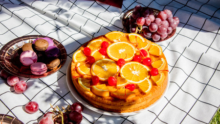 Orange and cherry pie on a checked cloth for picnic in a spring time. Side view