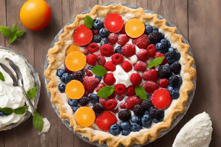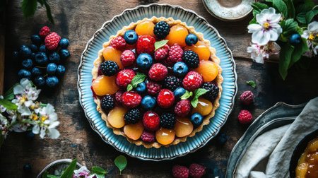 A visually stunning fruit tart displays an array of fresh berries and seasonal fruits. Set on a rustic wooden table, it invites indulgence during a sunny afternoon gathering.