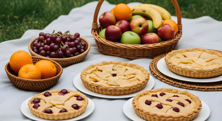 A delicious picnic spread laid out on a blanket in the grass, featuring a basket of fresh fruit and several whole fruit pies and tarts. The scene suggests a delightful summer gathering or outdoor dessert feast.