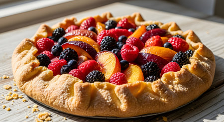A rustic fruit galette tart filled with fresh raspberries, blackberries, blueberries, and peach slices. The golden-brown crust and colorful fruit filling make for an appetizing homemade dessert on a wooden table.