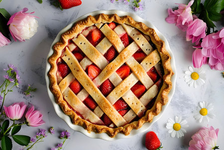 Freshly Baked Strawberry Pie on Marble Surface Surrounded by Spring Blossoms Concept of Homemade Baking Seasonal Dessert Culinary Art.