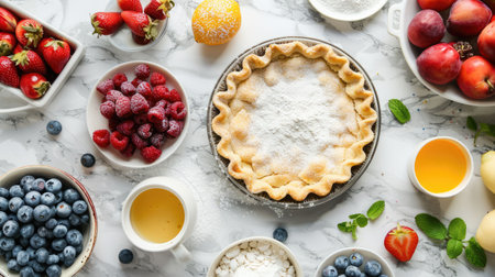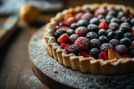 A berry tart topped with fresh fruits and lightly dusted with powdered sugar for a delightful finish. Generative AI