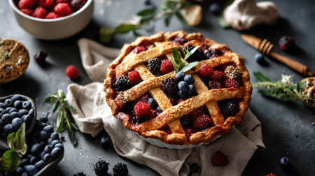 Freshly baked berry pie with lattice crust, surrounded by blueberries and raspberries on a wooden table in a cozy kitchen setting.