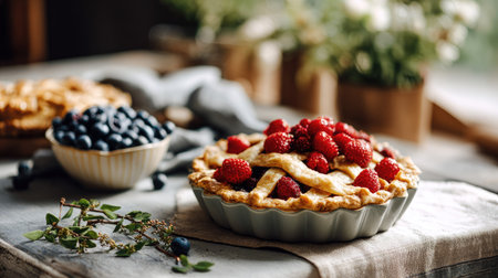 A beautiful pie filled with fresh raspberries and blueberries sits elegantly on a rustic kitchen table. The scene is enhanced by natural light and nearby flowers, showcasing a delightful summer dessert perfect for any gathering.