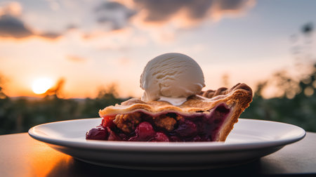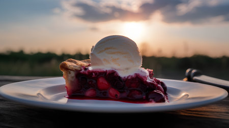 A tempting slice of pie topped with a scoop of creamy ice cream on a plate, Slice of blueberry pie topped with a scoop of ice cream on a sunny day near a window, AI Generated