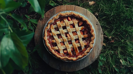 A beautifully crafted apple pie rests on a wooden surface, elegantly surrounded by lush greenery. The golden crust and rich filling evoke warmth and comfort, inviting all to indulge.