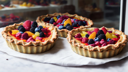 Display Of Colorful Fruit Pies And Tarts In Bakery Window. Generative AI