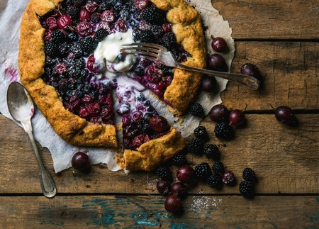 Homemade garden berry galetta or crostata sweet pie with melted vanilla ice-cream scoop on rustic wooden background. Top view, horizontal composition