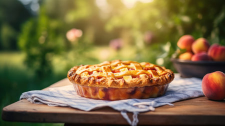 Fresh peach pie on a wooden table outdoors, with peaches around