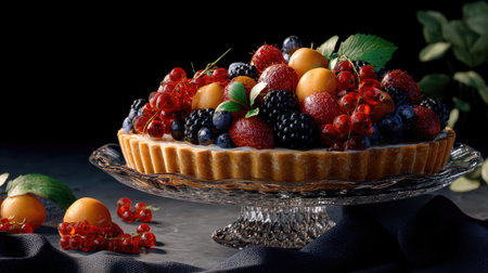 A stunning fruit tart artfully arranged with an array of fresh berries and stone fruit, set on an elegant glass stand. This dessert is perfect for any festive occasion.