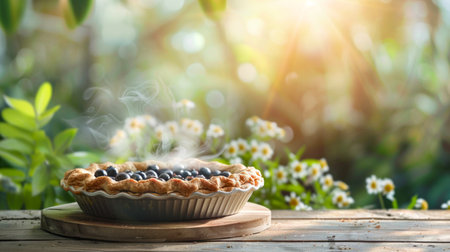 Freshly baked blueberry pie on a wooden table in a sunlit garden. Concept of homemade dessert, outdoor dining, fruit pastry, summer treat. Copy space.