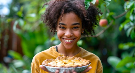 African American woman holding homemade apple pie in a garden. Concept of baking, homemade dessert, gardening, happiness.
