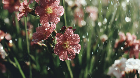 An enchanting scene of vibrant flowers illuminated by gentle rain, showcasing colorful petals adorned with dewdrops, creating a serene and refreshing nature experience.