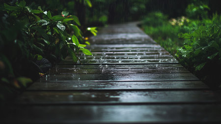 A wet wooden pathway in a forest, with raindrops clinging to nearby plants.