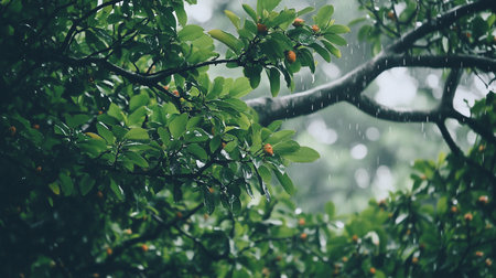 Close-up of vibrant green leaves and small orange buds glistening in a soft rain. The scene evokes tranquility and freshness, with raindrops creating a soothing atmosphere.