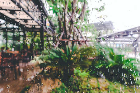 Rainy day in the city. Blurred background with raindrops.