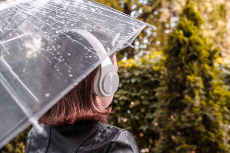 Autumn. Lonely sad redhead woman in a headphones walking in a park, garden. View through wet transparent umbrella with rain drops. Rainy day landscape. Vintage toned