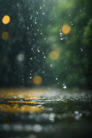 Rain drops falling on wet asphalt with blurred background and bokeh