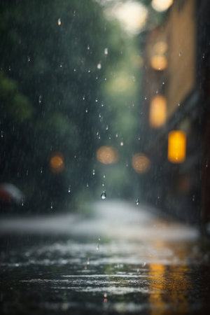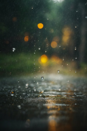 Raindrops on wet asphalt with bokeh background, shallow depth of field