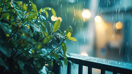 Rain falling on a balcony, with droplets collecting on the railing and plants.