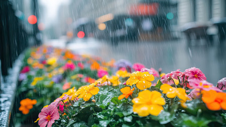 Rain falling softly on a row of colorful flowers along a city sidewalk.