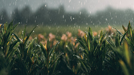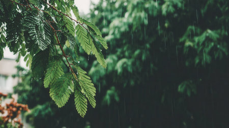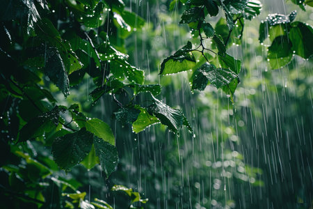 Captivating image showcasing rain falling gently on bright green leaves in a tranquil tropical garden, highlighting the serene beauty of nature during a refreshing shower.