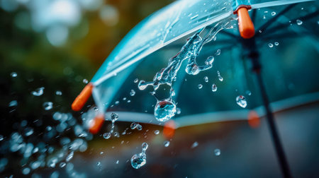 Transparent umbrella catching splashing raindrops with vivid motion and detail, symbolizing weather protection and rainy season atmosphere.