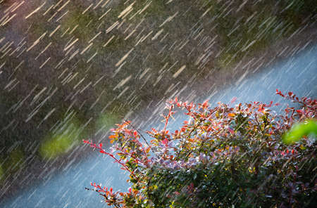 Plants leaves under a heavy rain shower with waterdrops in the golden rays of the sun in summer. Fresh rainy summer background. Rain and sun.