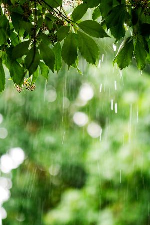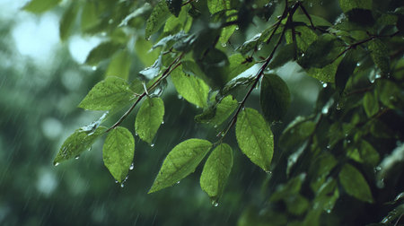 A close up view of bright green leaves on a tree branch with rain falling in a blurry forest background. A peaceful and refreshing nature scene.