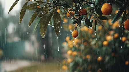 Soft rain falling gently on Citrus tree, with water droplets forming and slowly dripping. The background is softly blurred with a natural, moody atmosphere.