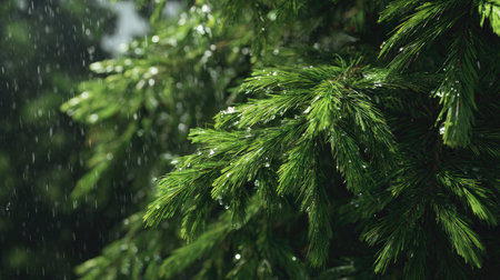 Spruce branches with drops of rain, bokeh background.