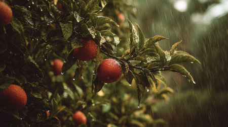 Blood orange in a storm, heavy rain pouring down, strong winds twisting their leaves