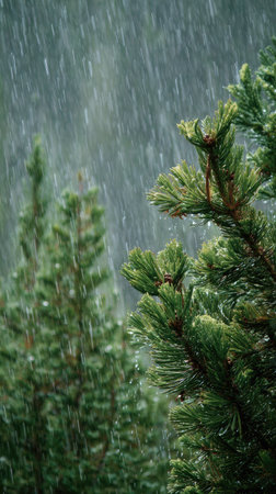 Balsam fir in a storm, heavy rain pouring down, strong winds twisting their leaves, natural.