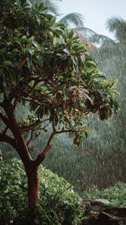 Guava tree in a storm, heavy rain pouring down, strong winds twisting their leaves, natural.