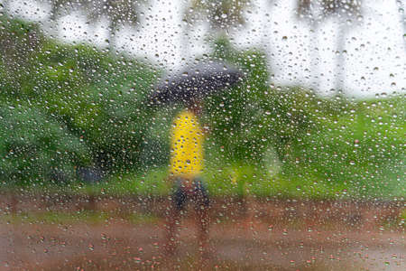Rain drops on the glass with umbrella in the garden at sunset.