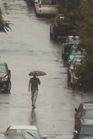 A man in shorts and a T-shirt walks with an umbrella in the rain. He is flanked by parked cars. On the wet asphalt, the man's reflection and the raindrops. It's a gray, rainy day. View from the back