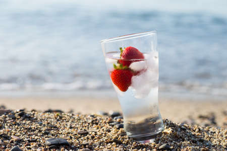 Frozen strawberry and pure water at the edge of the sea.