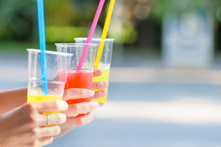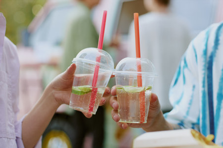 Medium close up of transparent plastic cups with sparkling craft lemonade in unrecognizable peoples hands