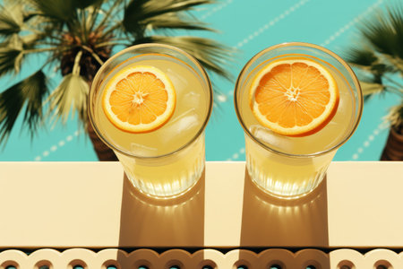 Glasses of lemonade with oranges, ice cubes and mint leaves on golden plate. Top view of lemonade on blue wooden background. Summer cold drinks under direct sun shines. Caustic reflection effect.