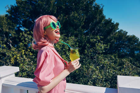 portrait of beautiful woman in pink dress outdoors with cocktail Summer day