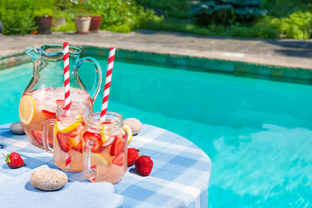 Ice cold homemade strawberry lemonade in jug and glasses with paper straws on outdoor summer pool side table plus copy space