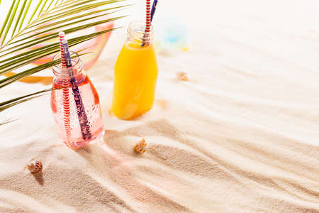 Summer tropical beach vacation background - cold fruit pink, yellow beverages in wet glass bottle with straw, hat, toy under green palm leaf on sand in sunlight, copy space.