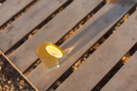 Fresh orange juice or a cocktail in a glass bottle with a straw on a yellow wooden bench on the beach or in the park.