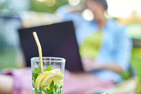 Summer citrus lemonade with reusable metal straws, Woman using typing