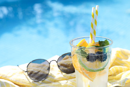 Glass of delicious cocktail near swimming pool, space for text. Refreshing drinks