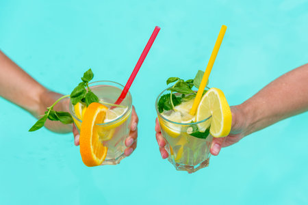 Two hands hold colorful cocktails garnished with fruits and mint over a blue pool. Perfect for depicting leisure, summer relaxation, and tropical vacation vibes.